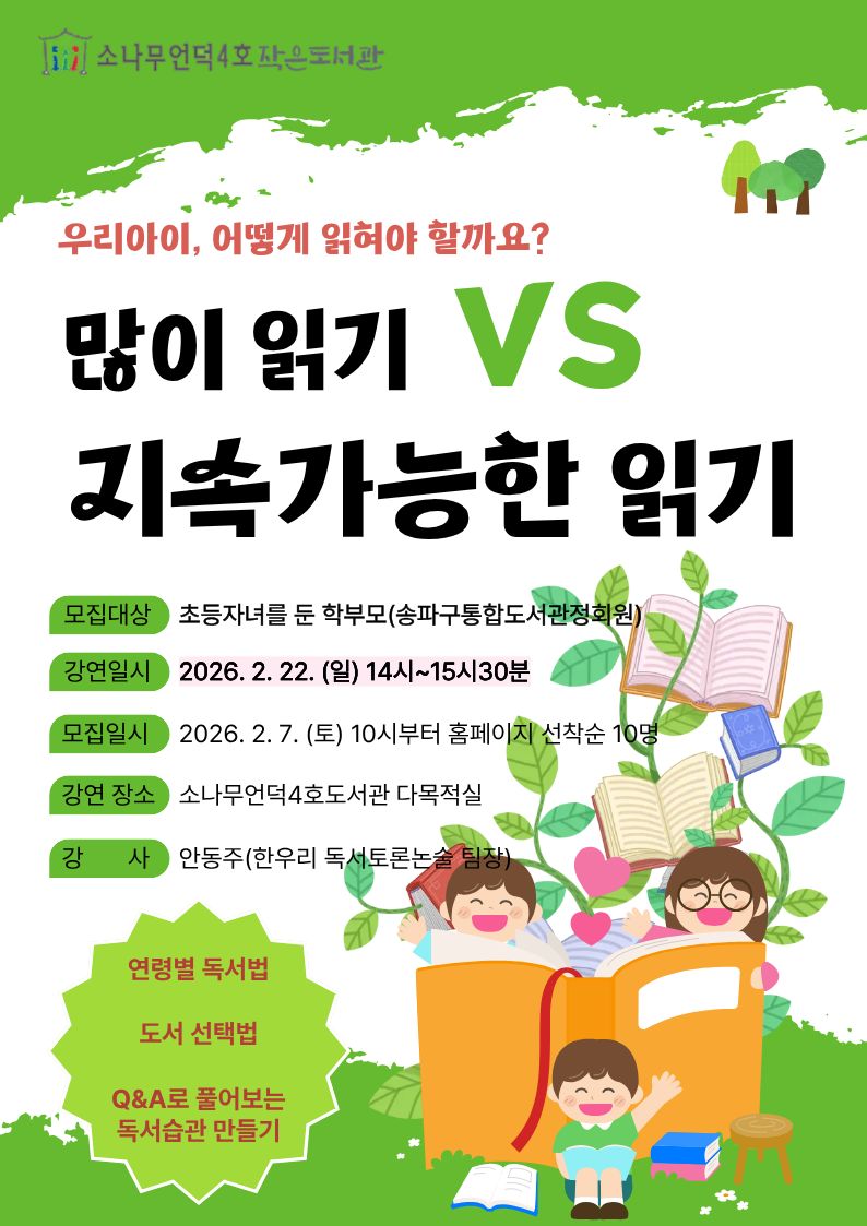 - 프로그램 접수는 송파구통합도서관 회원카드를 발급받은 정회원만 신청이 가능합니다.