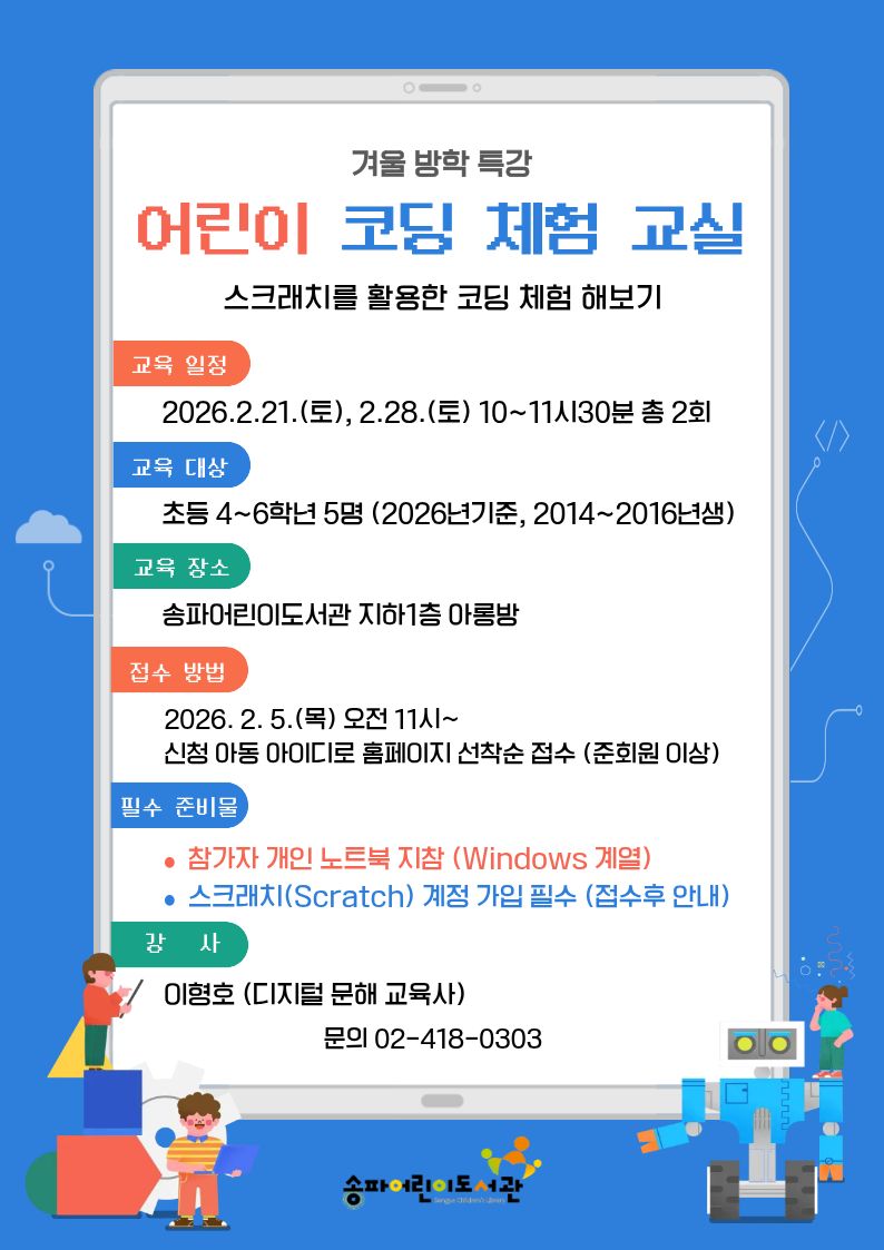 송파어린이도서관에서 겨울방학특강으로 '어린이 코딩 체험 교실'을 진행합니다.